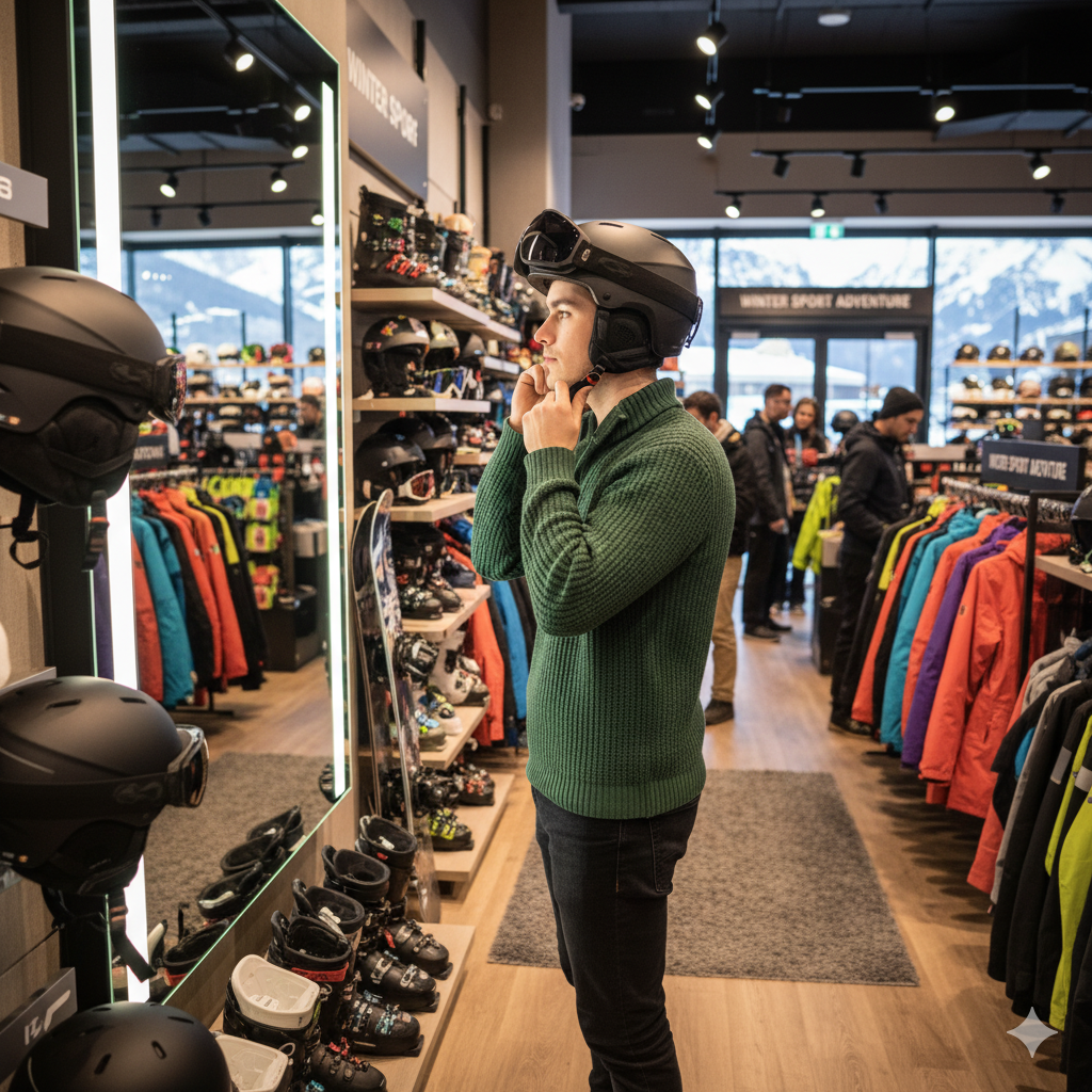 Катаемся в шлеме. Шлем можно взять в прокате. Надеваем на голову без шапки, можно с подшлемником/балаклавой, но в Архызе обычно жарко кататься в балаклаве.