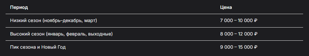 В среднем: около 9500 ₽ за 2 часа для одного человека — независимо от того, лыжи или сноуборд, ребёнок или взрослый. За самых маленьких могут даже попросить доплату.